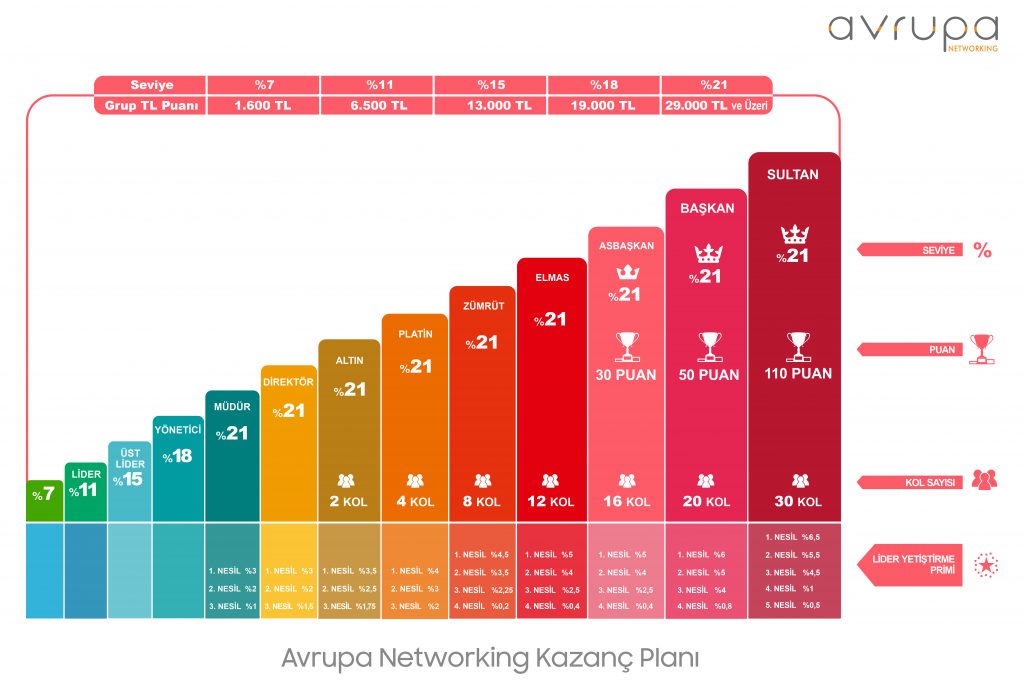 Avrupa Networking Girişimci Kitapçını okuyarak detaylı bilgiye sahip olabilirsiniz ve Avrupa Networking kazanç planı tablosunu inceleyebilirsiniz. Girişimci Kazanç Planında belirtilen ve prim kazanılabilmesi için girişimci tarafından bir ay içinde verilmesi gereken sipariş tutarı Kazanç Planı‘nda belirtilmiştir. Promosyondan alınan ürünler, kargo ve katalog bedelleri prim sistemine dahil edilmeyecektir. %21 Prim Grubu’nda Yer alan girişimciler her ayın 7. gününe kadar kişisel siparişlerini vermek zorundadır.