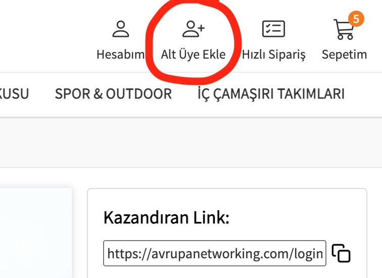 Alt üye eklemek için hesabınızda ana sayfada sağ üstte yer alan Alt Üye Ekle butonuna basın. Açılan formda Sponsor Kodu kısmında otomatik olarak sizin girişimci numaranız çıkacaktır. Alt üye olarak ekleyeceğiniz kişinin bilgilerini doğru bir şekilde sisteme girmeye devam edin. İlgili tercihleri de yaptıktan sonra Kaydet butonuna tıkladığınızda üyelik bilgileri kişinin cep telefonuna gönderilecektir.